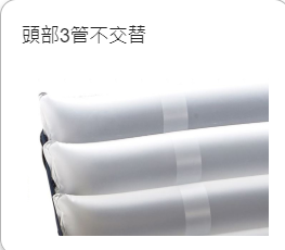 更多氣管條去支撐人體,遠比一般其他氣墊床規格如17或18管的,更能去縮短管跟管之間的支撐距離,尤其接近最重的臀部及胸部更是有明顯的綿密保護,使其不易因管條距離太開而接觸到底部,造成有壓瘡的危機