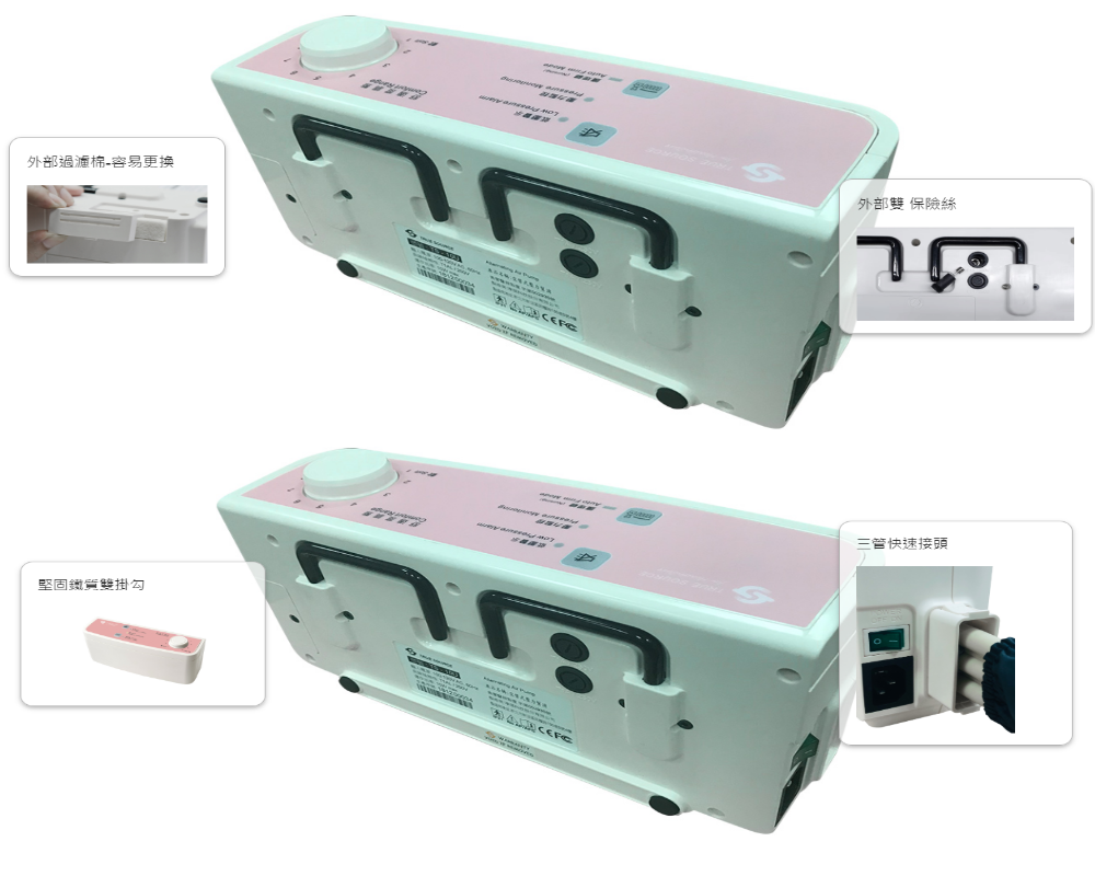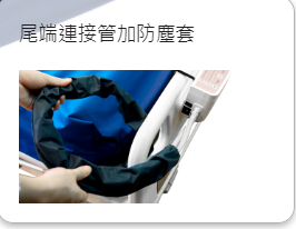 在床延伸的尾端到主機的連接風管,有加上保護套管,可增加連接管連結強度,減少髒污,降低破損機率